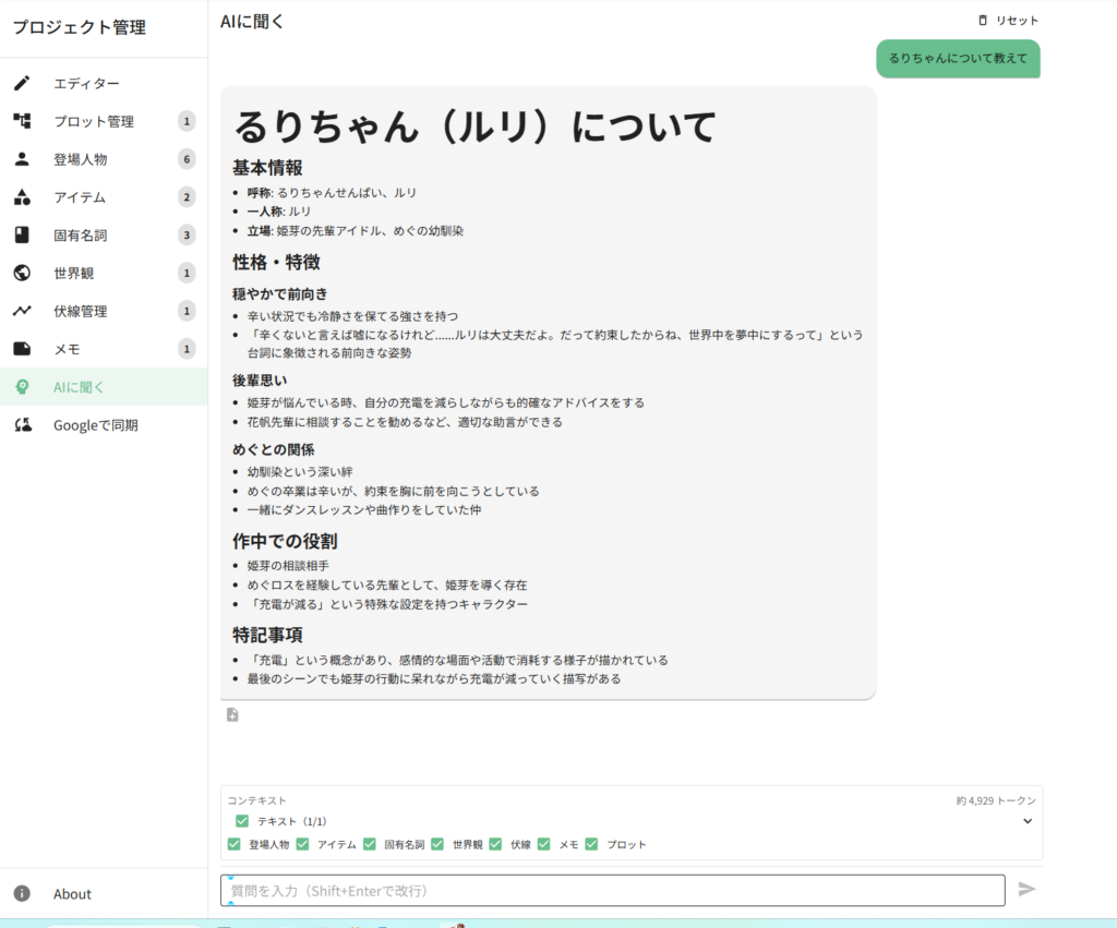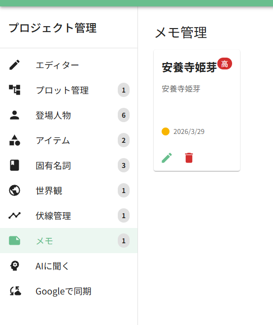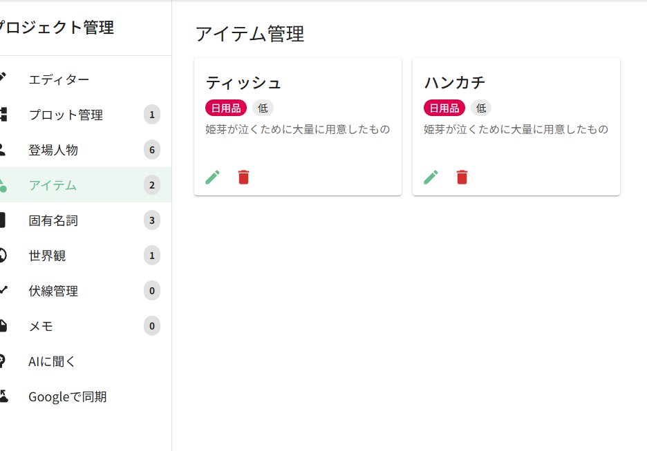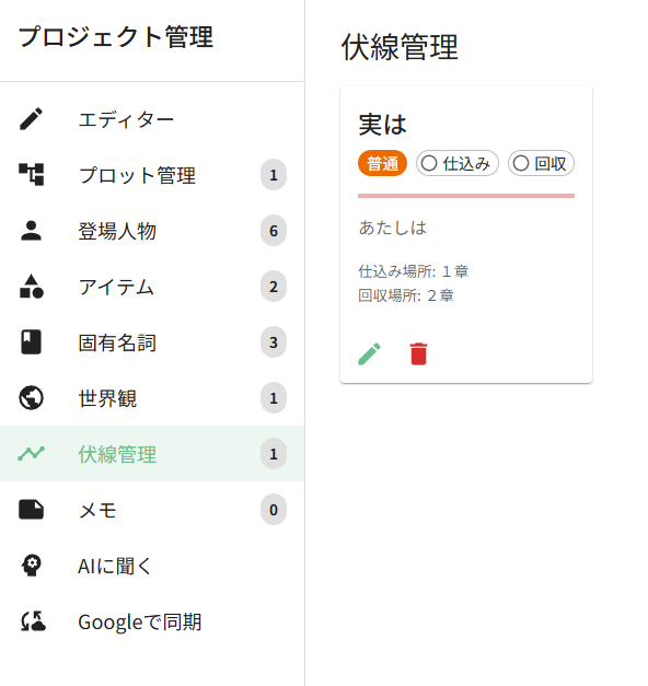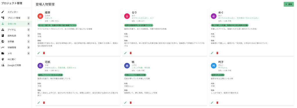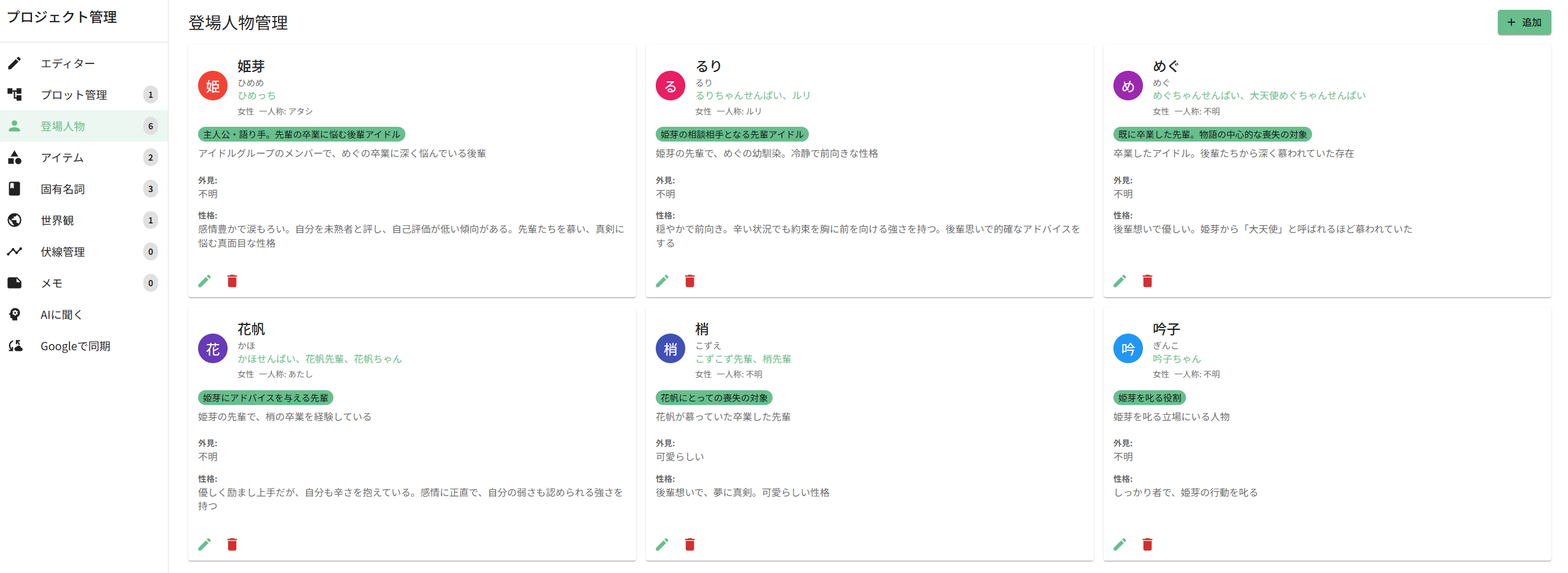 プロットを管理できます。正直私はあまり使っていません(メモ使ってる)が、AIが導入したほうがいいかも!って言っていたので実装した。