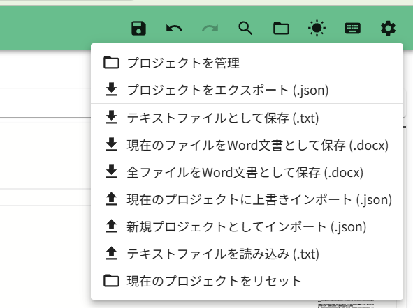 保存、Redo/Undo、検索、セリフ分析機能、検索、プロジェクト管理、テーマ変更、ショートカット確認、設定。