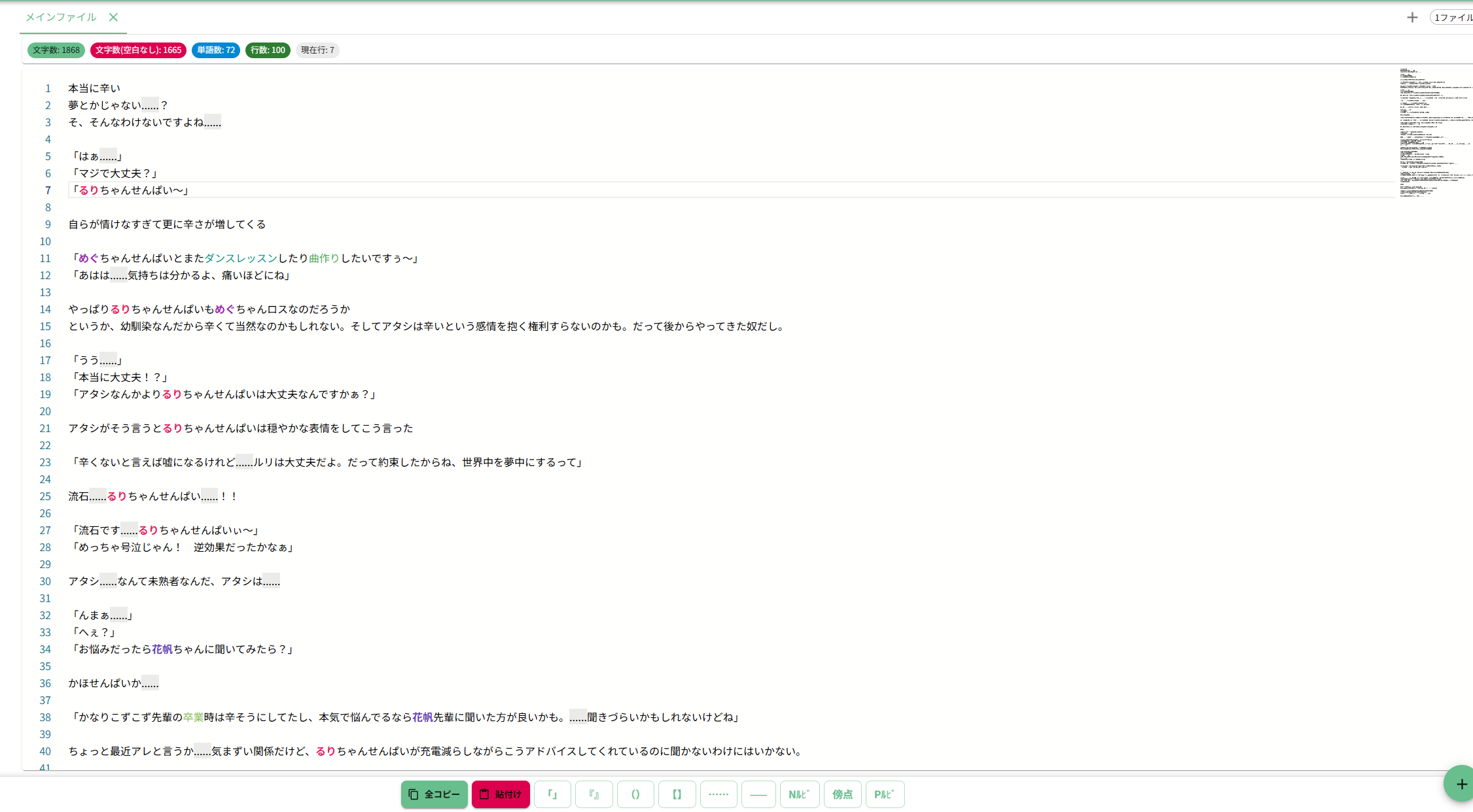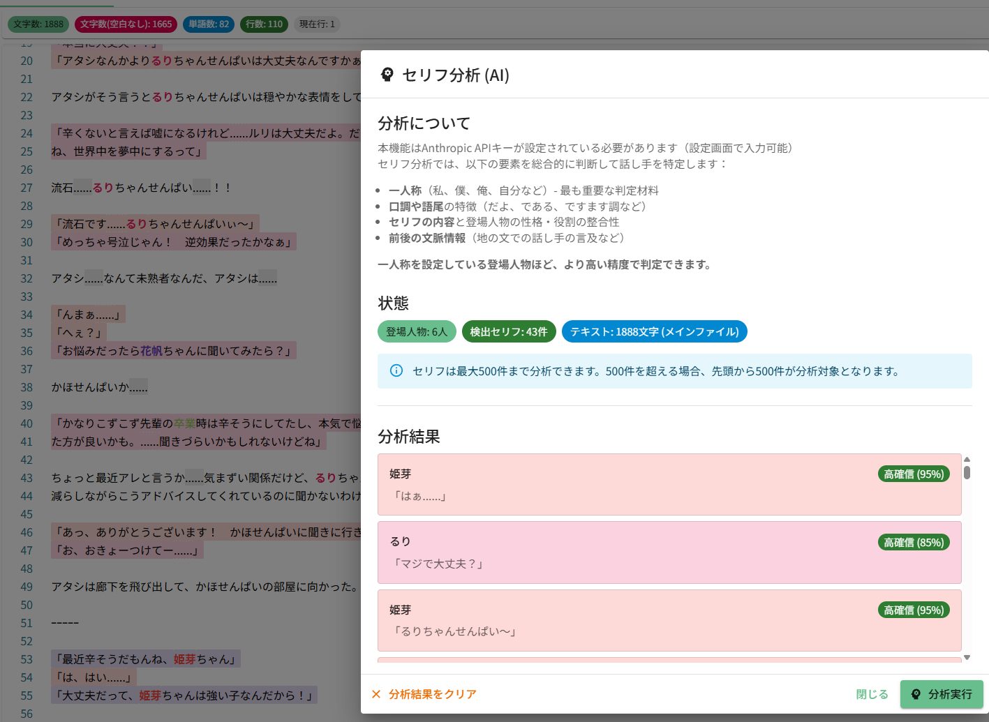 AIによってそのセリフがどのキャラのものなのか判定する。このセリフ不自然かな?と思ったら使える機能。色も付けてくれる。軽量モデルでも良いし、軽量モデルは馬鹿なのでむしろ軽量モデルの方がいいかも。誰が見てもセリフとキャラがあっているか複雑な推論しなくてもわかるという意味では。