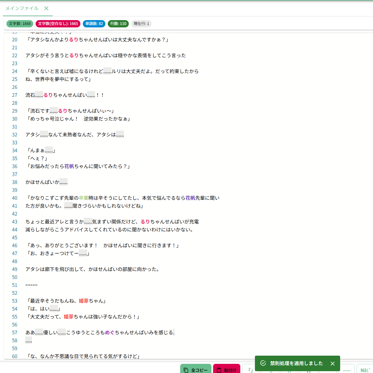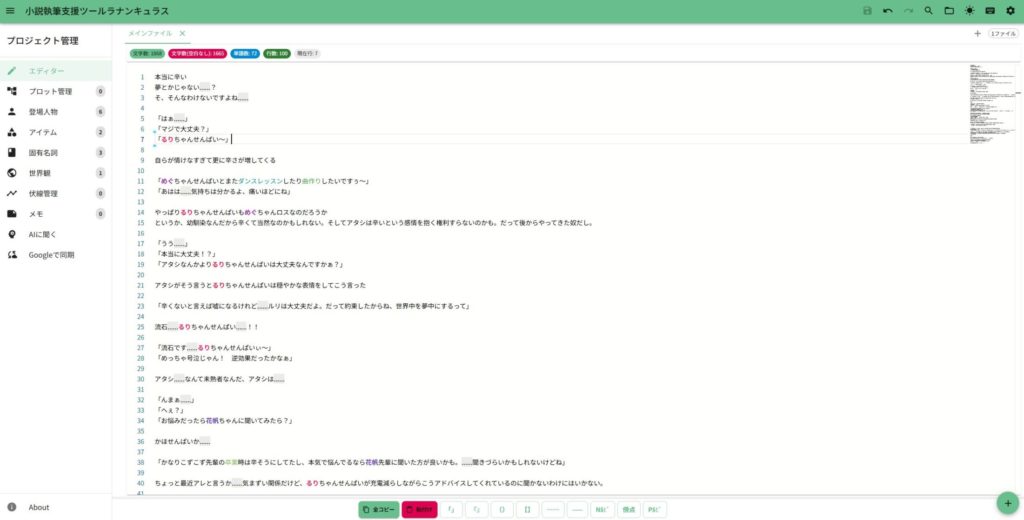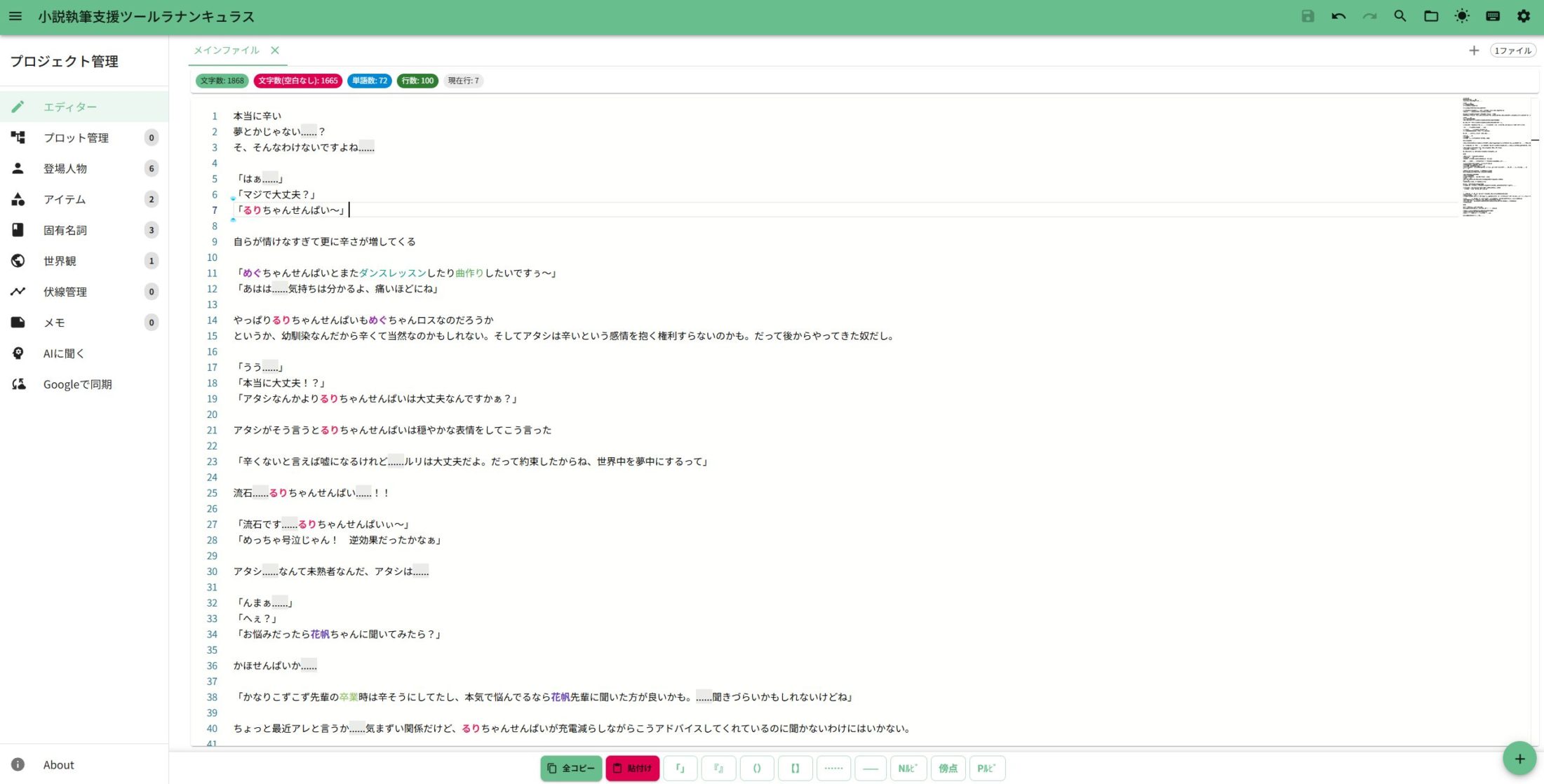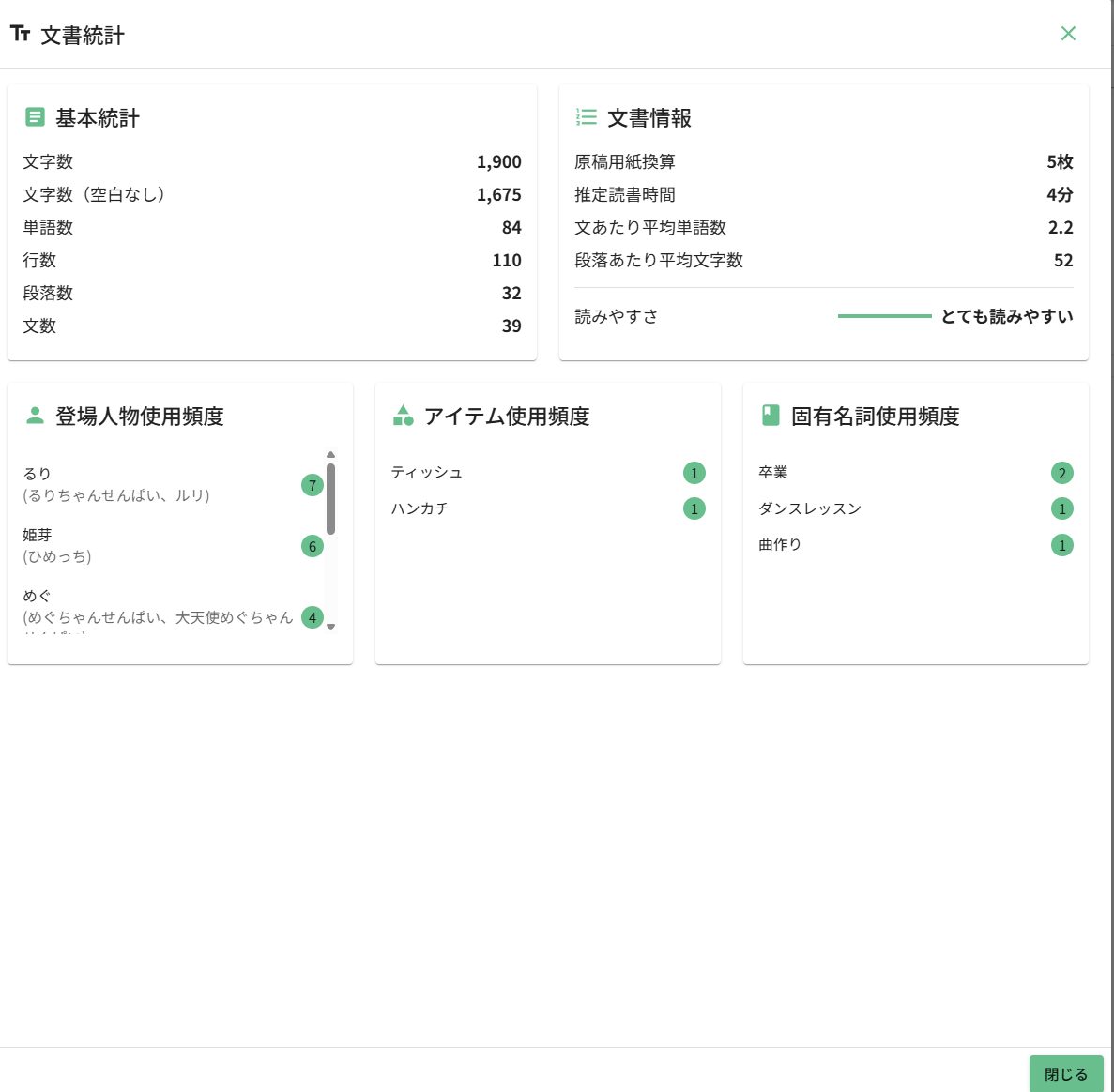 文章の文字数やキャラの登場回数、文章の読みやすさなどを機械的に検出できます。