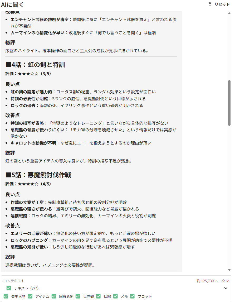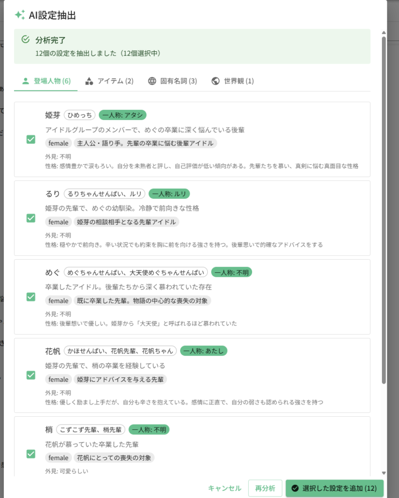 AIを使って本文からキャラ名や世界観を抽出して保存できる機能。sonnet以上のモデル推奨。