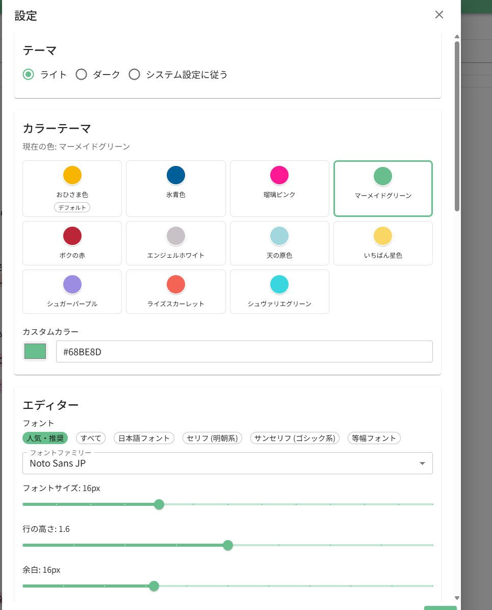 お気に入りの機能、テーマ切り替え。MUI、モダンなテーマ。更に設定から配色を蓮ノ空メンバーに切り替え可能。Webフォントも使える。