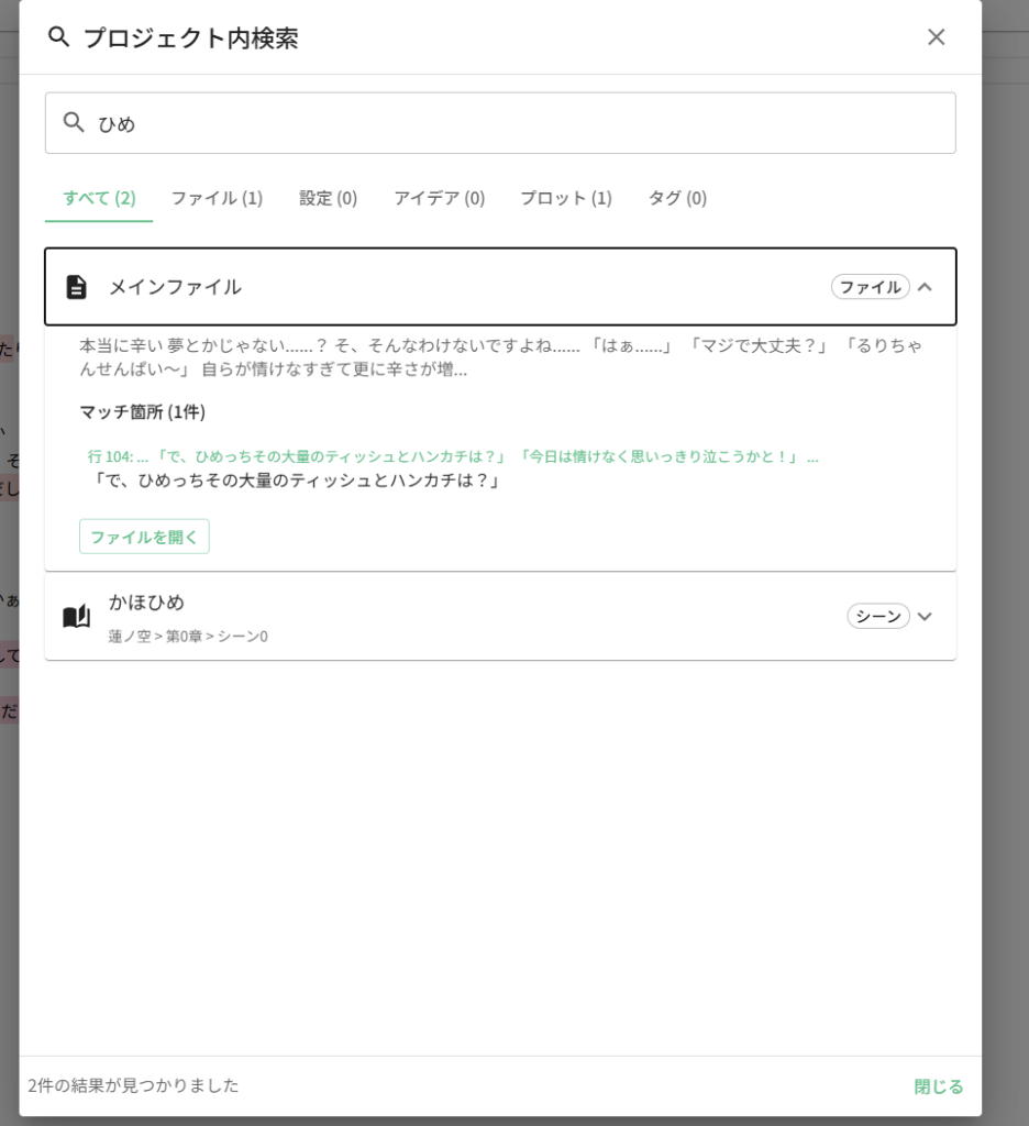 プロジェクト管理機能。プロジェクトを切り替えるとファイルや登場人物などをまるごと切り替えることが可能。ストレージはIndexedDBなので基本的には無制限に登録可能。